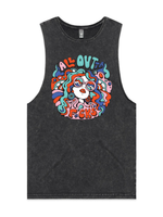 Sleeveless tank, raw armhole edges, stone wash finish with a worn look