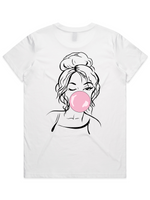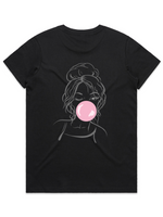 Blowing a bubble gum bubble is associated with a playful and carefree demeanor and a bit of cheeky sass!  Our, latest design represents a woman's light-heartedness and enjoyment of simple pleasures and innocence.  The act of blowing a bubble gum bubble requires a certain level of confidence and skill (trust me, I have been trying to teach my 8 yo daughter how to do it.... challenging!)