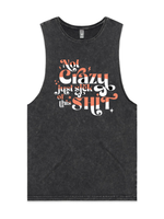 Sleeveless tank, raw armhole edges, stone wash finish with a worn look
