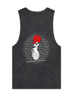 Sleeveless tank, raw armhole edges, stone wash finish with a worn look, ribbed crew neck, shoulder to shoulder tape, double needle bottom hem, preshrunk to minimise shrinkage