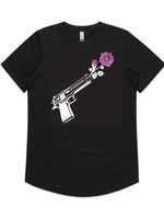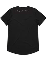 Through Darkness She Blooms Curved-Hem Black Tee, Pink Rose